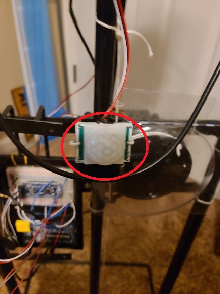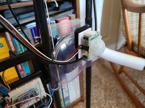 PIR Sensor arrived, used wires from old sensor and wired into circuit, added a little coding and we now have the proximity sensor complete! Temporarily mounted with a wire holding it in place, it will need a custom bracket to firmly mount it to the frame. Looks like it is time for some 3d printing! Now only have the Jaw movement to figure out, this one may be a bit of a challange.
