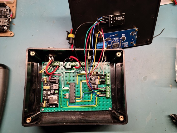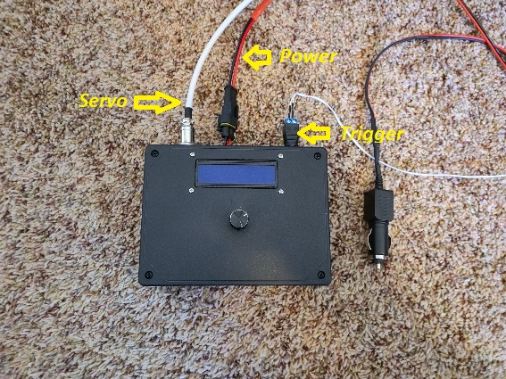 Completed main box with cables hooked up (notice: cigarette lighter plug for power)